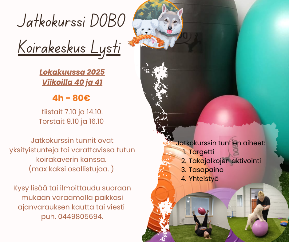 Dobo sopii kaiken kuntoisille ohjaajille, ja terveille yli 5kk ikäisille koirille. Mikäli koirallasi on jokin sairaus, vamma tai muu terveydellinen ongelma, konsultoi eläinlääkäriä tai fysioterapeuttia ennen dobo-kurssille ilmoittautumista.